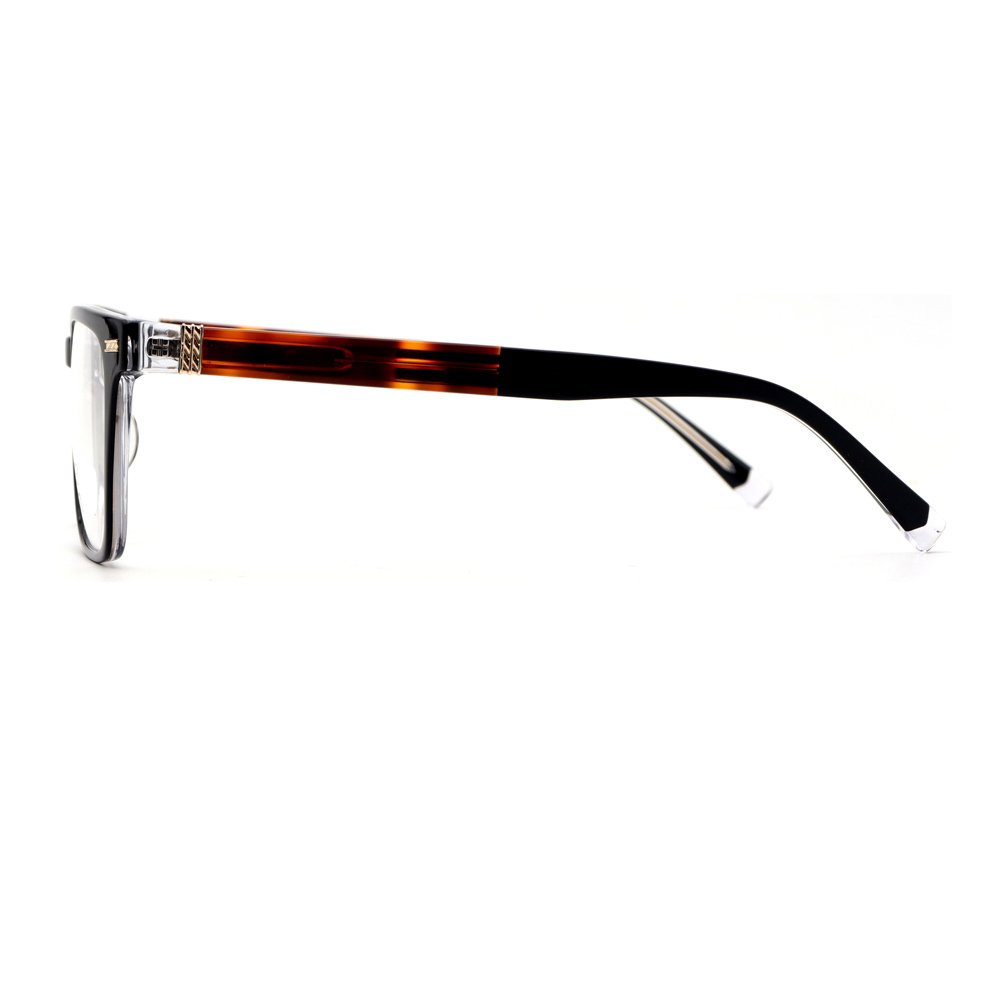 This Acetate square optical frame features a sleek black front with tortoise – patterned temple arms, combined with metal accents for a sophisticated look. Crafted from premium acetate, it offers durability and a comfortable fit, ideal for those seeking a blend of classic and modern style. Grey color is also available, which looks cultured and knowledgable.