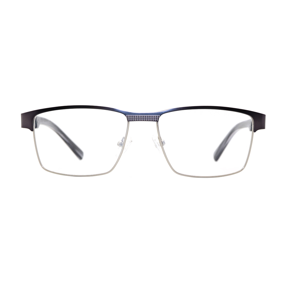 This men’s browline metal optical frame flatters various face shapes with its tailored silhouette. Crafted from premium metal, it features a sleek two-tone design (available in three colors) with textured detailing on the brow and temples, ensuring both durability and stylish sophistication. A perfect blend of ergonomic comfort and modern elegance, ideal for the style-conscious seeking a refined, face-flattering eyewear choice.
