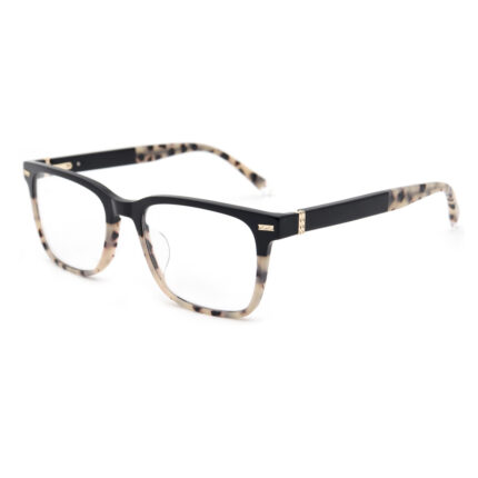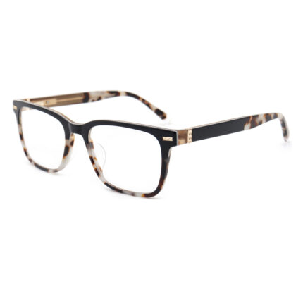 Premium acetate square optical frame with black or grey front, tortoise temple arms, and metal details for a chic, durable design.